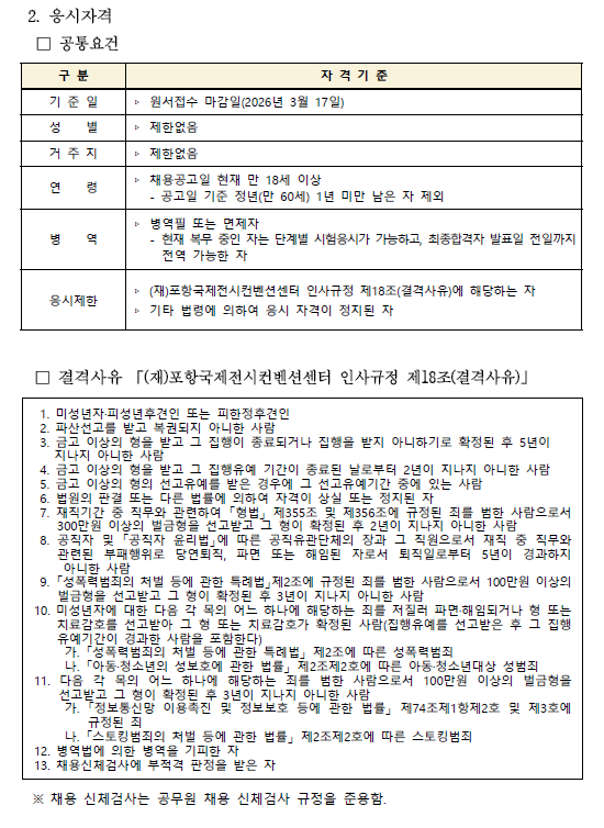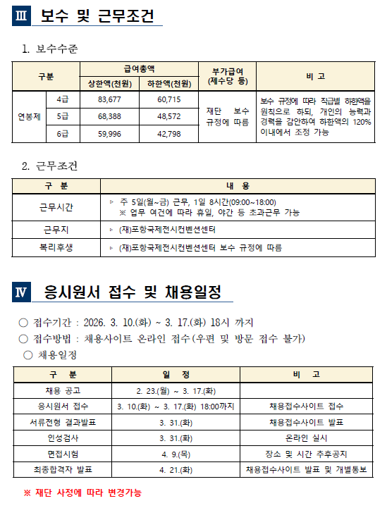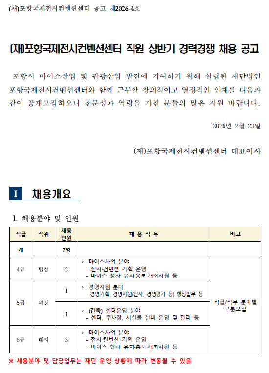 - [붙임1]포항국제전시컨벤션센터 26년 상반기 직원 채용 공고.pdf (364.4K) 0회 다운로드 | DATE : 2026-02-23 11:19:34