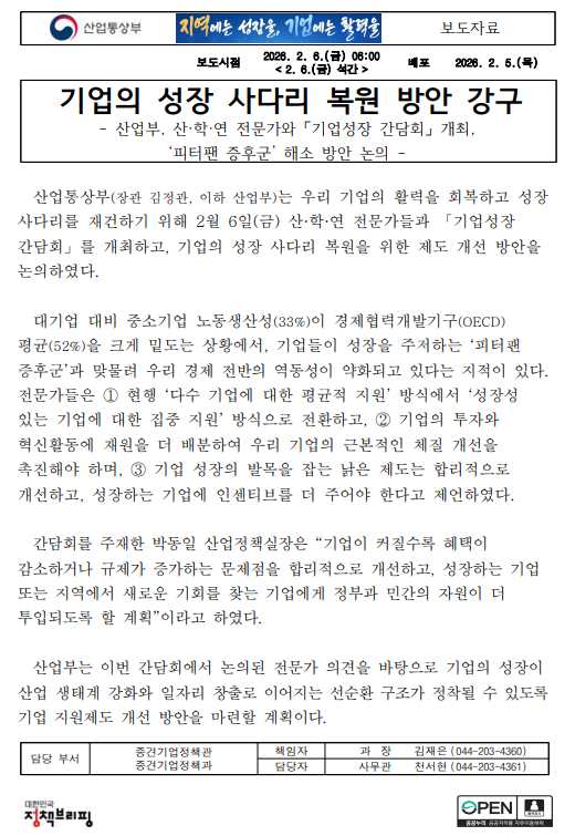 - 020506석간중견기업정책과, 기업의 성장 사다리 복원 방안 강구.pdf (230.2K) 0회 다운로드 | DATE : 2026-02-06 09:41:35